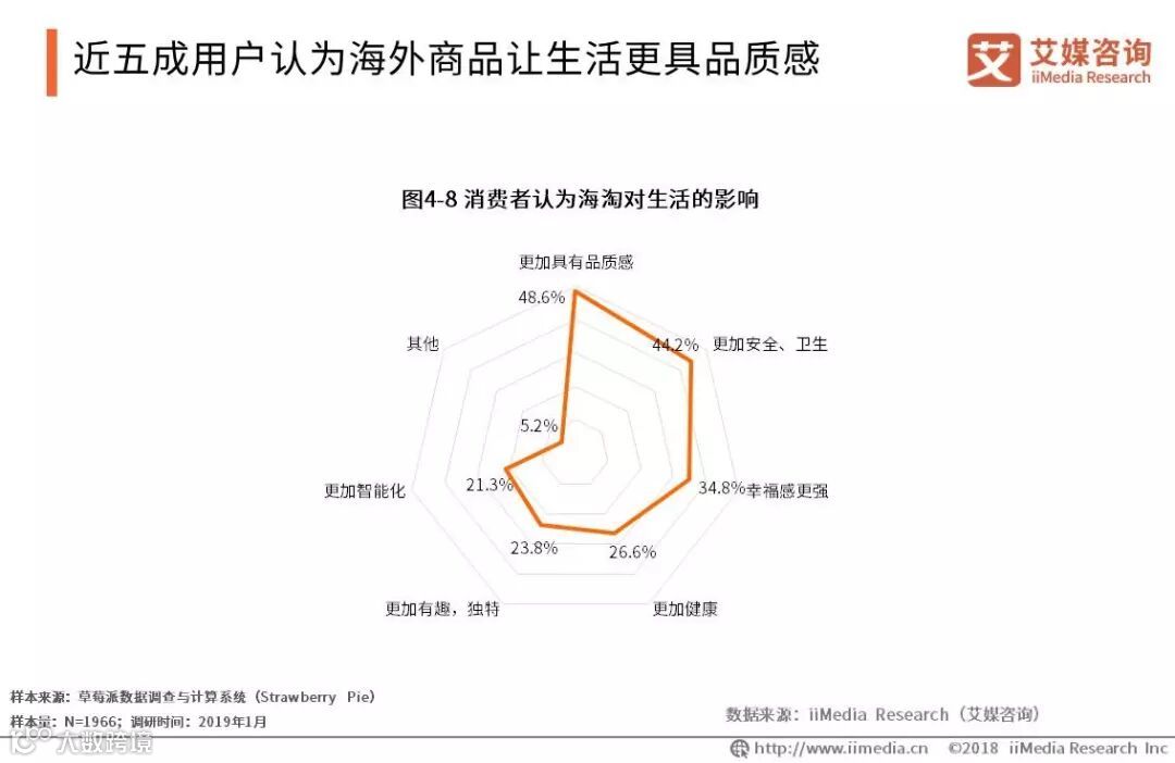 iiMedia Research(艾媒咨询)数据显示,2018年,48.6%的用户认为海外商品使生活更具品质感,44.2%的用户认为海外商品让生活更加安全、卫生,34.8%的用户认为海外商品让生活幸福感更强。