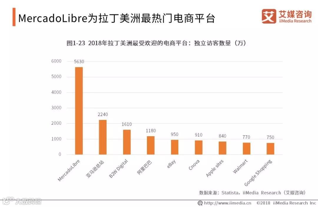 2018年拉丁美洲最热门的电商平台是MercadoLibre,访客数量远远多于其他平台。其次是亚马逊总站,阿里巴巴位列第四。