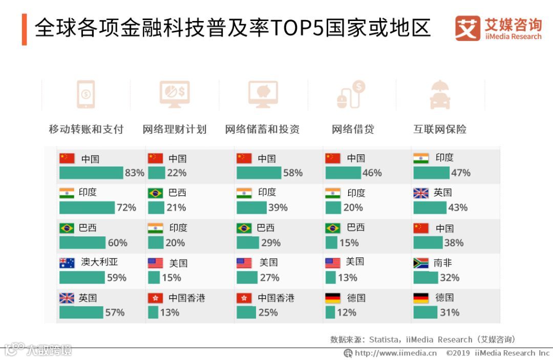 全球各项金融科技普及率TOP5国家或地区