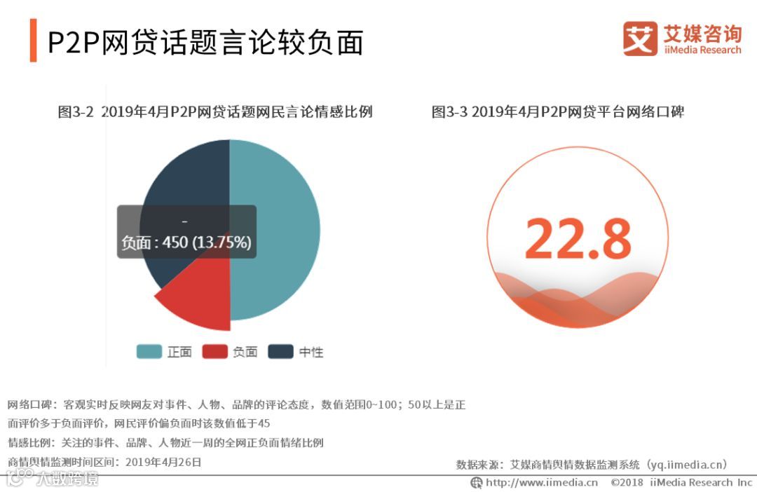 艾媒商情舆情数据监控系统监测显示,关于P2P网贷平台的言论情感比例中负面言论占13.75%,P2P网贷平台口碑为22.8,说明近日P2P网贷平台言论较负面。