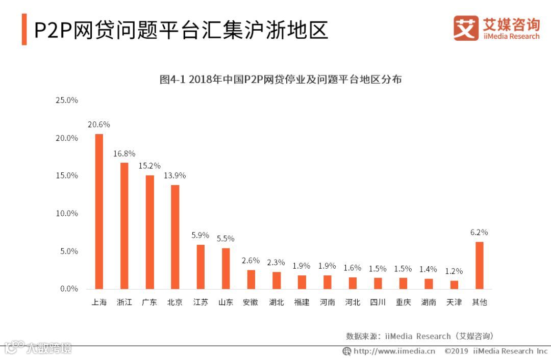 iiMedia Research(艾媒咨询)数据显示,在2018年中国P2P网贷停业及问题平台中,上海、浙江汇集了国内近四成的P2P网贷停业及问题平台,分别占比20.6%和16.8%。