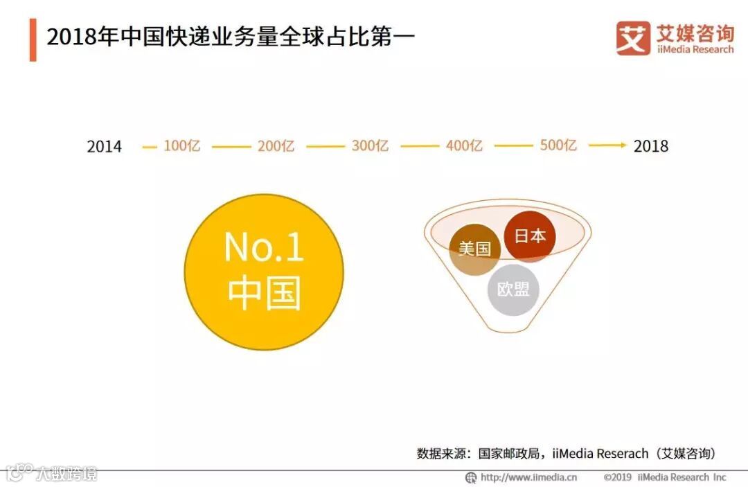 2018年中国快递业务量达到500亿件,连续五年稳居世界第一,是第二名美国的3倍多,超过美、日、欧等发达经济体总和。