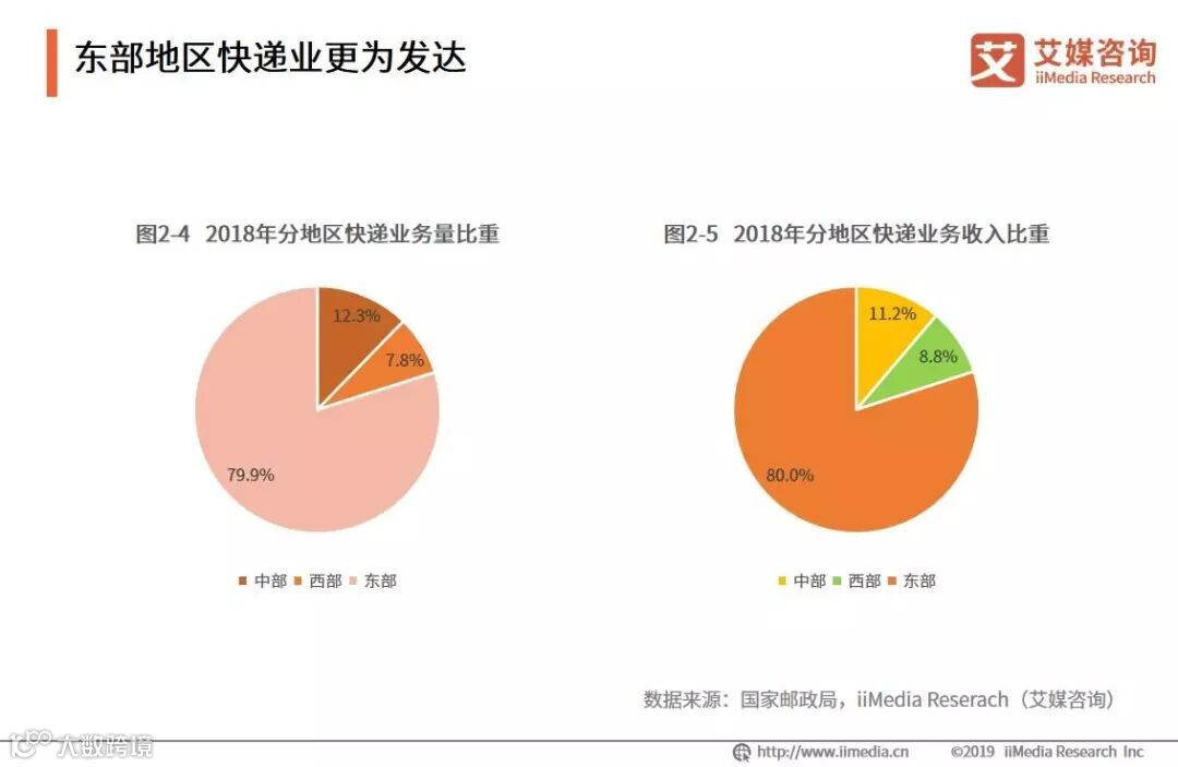 2018年,东、中、西部地区快递业务量比重分别为79.9%、12.3%和7.8%,业务收入比重分别为80%、11.2%和8.8%。