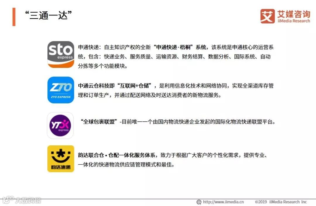2018年顺丰与通达系快递企业总业务量占中国快递总业务量的61.4%,相比较2017的57.3%,市场占比提升4.1个百分比,快递头部企业市场占比持续扩张,中小企业生存空间不断缩减,需要避免同质化竞争,寻找合适的发展方向。