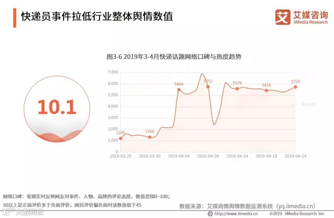 虽然公众对于快递行业的服务满意度有所提升,但是快递业乱象现象仍然普遍存在,iiMedia Research(艾媒咨询)数据显示,2019年3月-4月之间,快递话题网络口碑偏低,快递话题从4月初开始保持较高热度,艾媒咨询分析师认为这与京东日前发布的“调薪”声明及顺丰快递员私拆包裹事件有关。