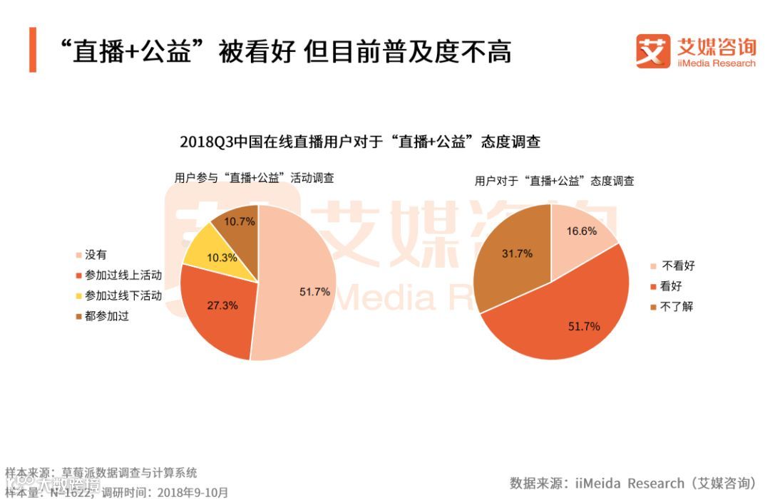 iiMeida Research(艾媒咨询)数据显示,51.7%的用户表示没有参与过“直播+公益”活动,而对于“直播+公益”的前景,51.7%的用户表示看好,但同时有31.7%的在线直播用户不了解该类型的活动。艾媒咨询分析师认为,近年来,各大直播平台都相继发起“直播+公益”活动,然而用户参与度较低,活动普及度仍有待提高。