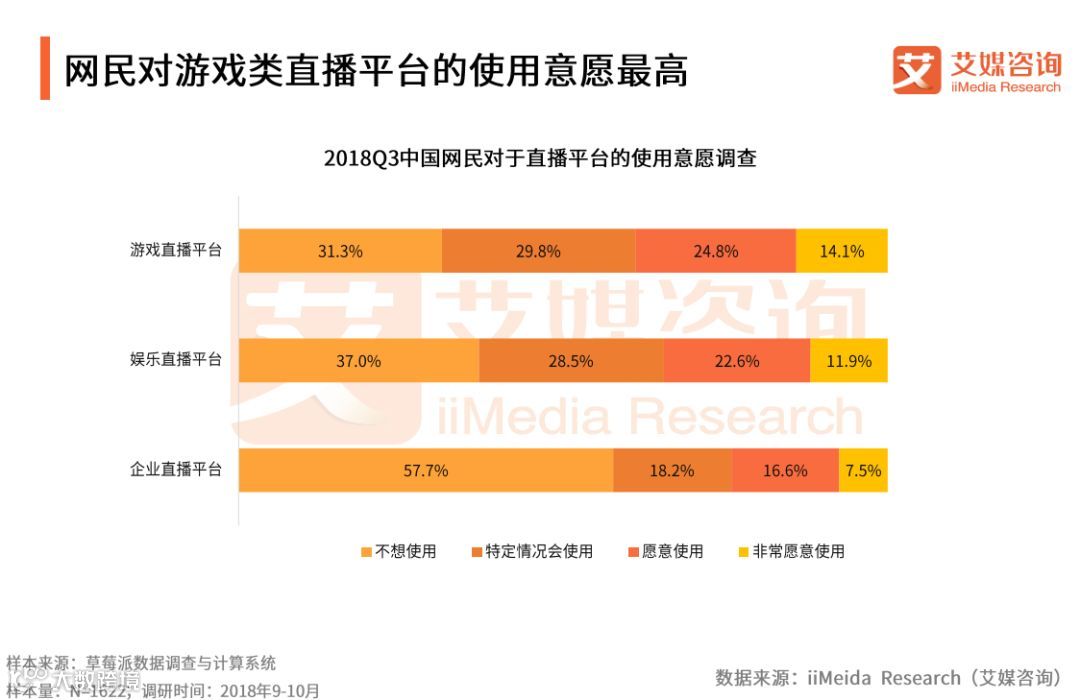 iiMeida Research(艾媒咨询)数据显示,近四成受访网民表示有意愿使用游戏类直播平台,近三成受访网民表示在特定情况下愿意使用;而娱乐类直播平台与企业直播平台的使用意愿分别达34.5%、24.1%。