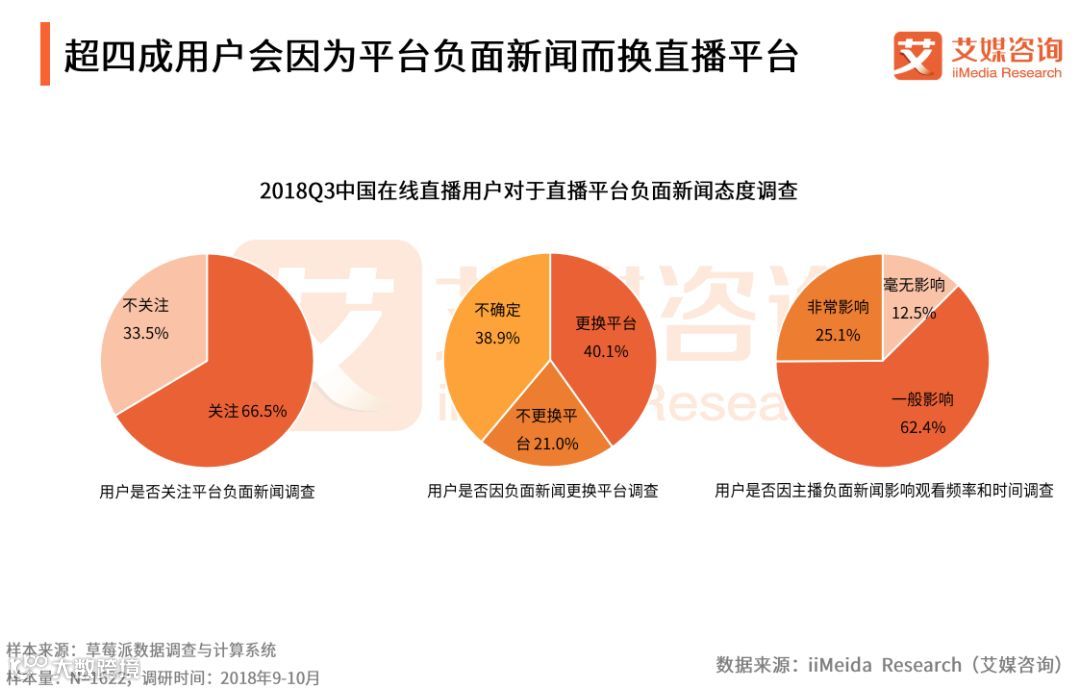 iiMeida Research(艾媒咨询)数据显示,66.5%的用户会关注直播平台负面新闻,40.1%用户会因为平台负面新闻而更换直播平台,主播负面新闻对于用户观看时间和频率有显著影响。