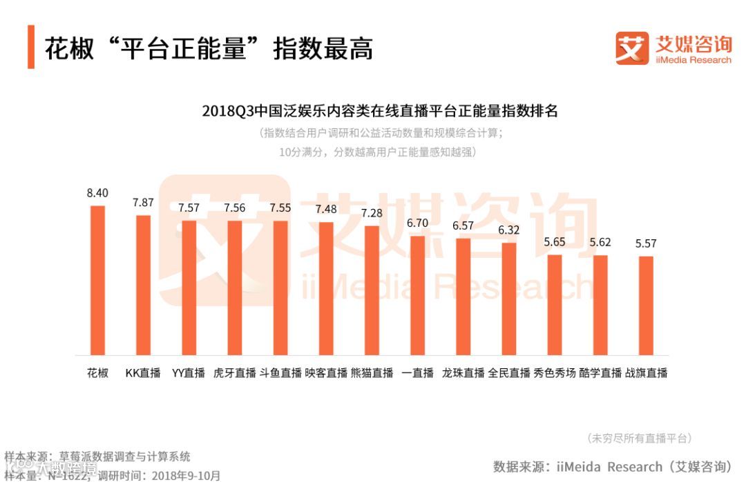 iiMeida Research(艾媒咨询)数据显示,花椒“平台正能量”指数最高,为8.40分,KK直播以7.87的正能量指数排名第二。艾媒咨询分析师认为,花椒与KK直播近年加强公益活动方面布局,其公益活动如花椒的“瞳爱光明花椒公益之夜”和KK直播的“百万扶植计划”都受到用户和社会的认可,正能量指数较高。