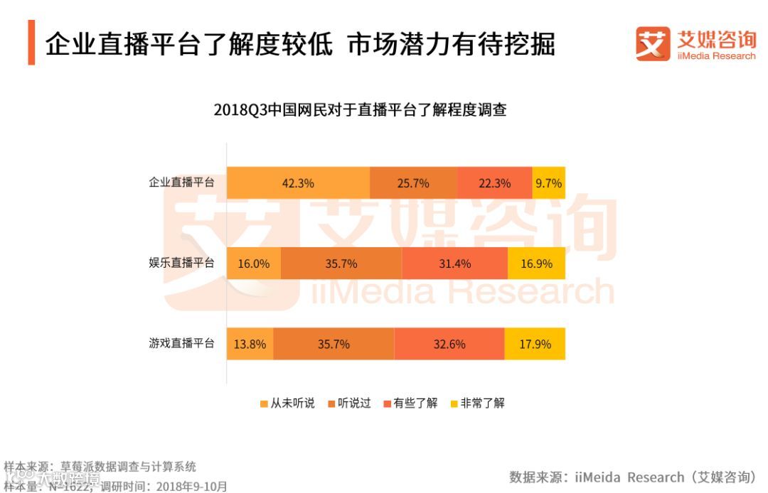 iiMeida Research(艾媒咨询)数据显示,超八成受访网民都对游戏内容类直播平台和娱乐内容类直播平台有所了解,但42.3%的网民从未听说过企业直播平台。艾媒咨询分析师认为,泛娱乐直播平台行业格局基本形成,已经形成用户认知和用户习惯。企业直播有固定需求和较高的经济效益,但从目前的了解程度来看,市场潜力有待挖掘。