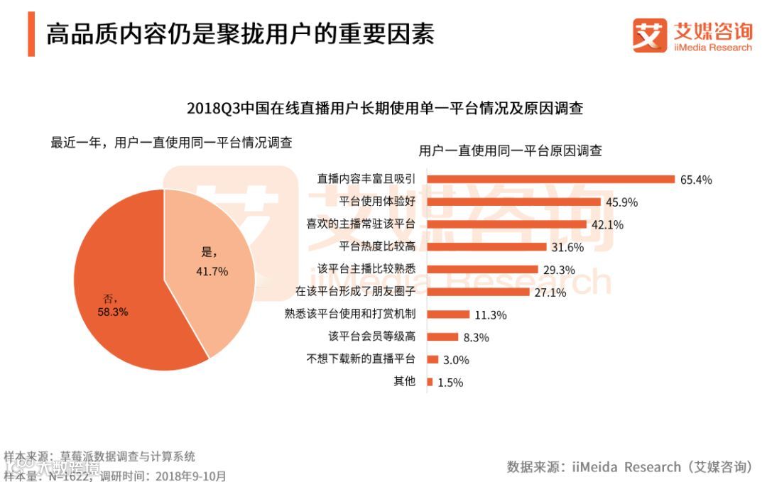 iiMeida Research(艾媒咨询)数据显示,41.7%的在线直播用户在最近一年一直使用同一平台,65.4%的用户因直播内容而一直使用某平台。艾媒咨询分析师认为,优质内容依然是直播平台的核心竞争力,平台用户体验良好则是重要支撑,而打赏机制和会员系统对于用户的选择决策影响力有限。