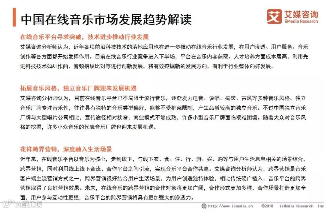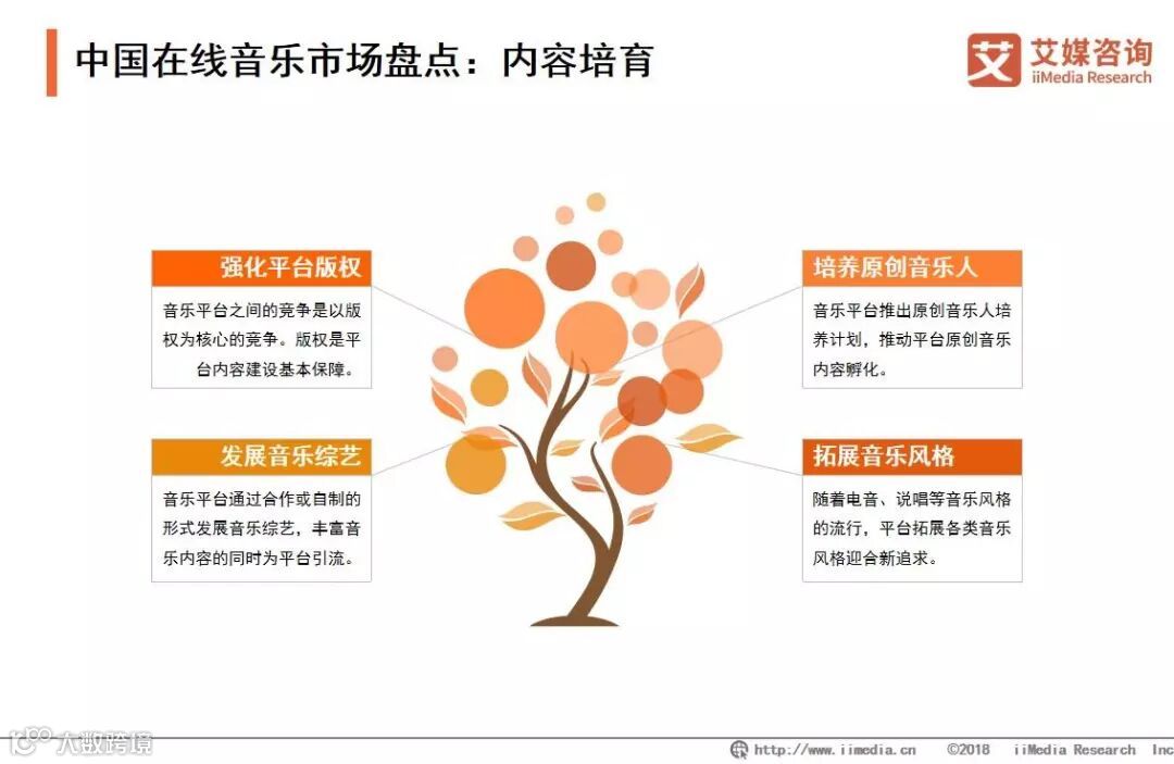2018年,随着独家授权互授,各大音乐平台进入“后版权时代”。艾媒咨询分析师认为,在后版权时代,中国音乐平台将以版权为基础,纵向深挖,增强平台自身内容孵化能力,横向扩张,拓宽内容宣发和变现的渠道。做好内容培育是音乐平台跑赢下半场竞争的燃料,音乐平台通过强化平台版权,音乐人计划和音乐综艺的内容孵化,同时拓展各类音乐风格,为内容培育做好奠基。