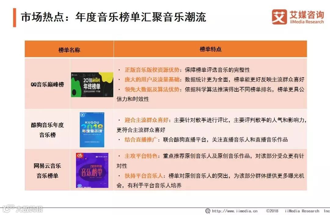 中国主流在线音乐平台通过大数据统计用户行为,实时记录并按时段更新平台的音乐排行榜排行榜。这些排行榜是音乐平台年度音乐盛典颁奖的主要依据。不同平台的榜单的差异性也逐渐显现,QQ音乐因海量正版音乐版权资源和用户基础,巅峰榜作为流行音乐风向标的权威性和公信力更受认可。