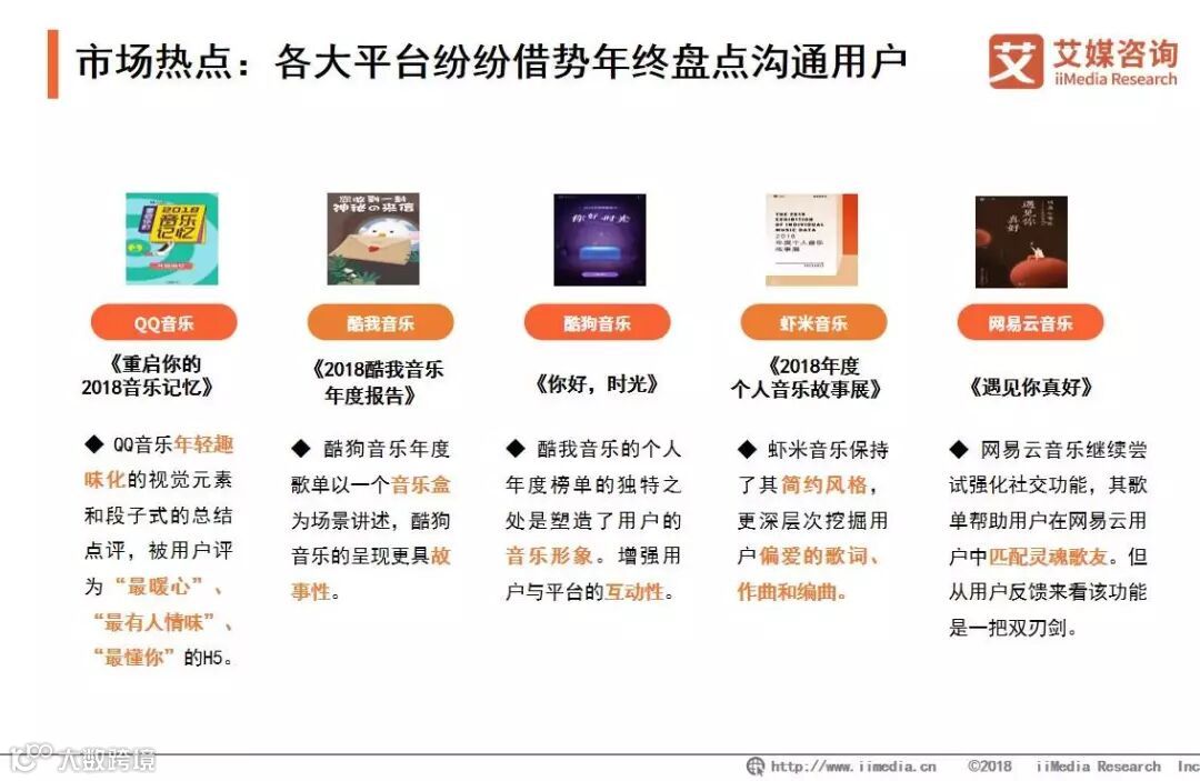 2018年末-2019年初,各大音乐平台陆续发布了个人年终盘点H5,获得用户广泛关注和互动。每个音乐平台客户端发布的个人年终盘点主要包含用户年度听歌数量、听歌总时长、最喜欢听的歌、最喜欢的音乐类型、年度歌手、最晚听歌记录等。艾媒咨询分析师认为,定制化的个人年终盘点连接了用户一年来的温馨回忆,传递了平台对每位用户个性化的关怀与理解,成为平台塑造温暖形象的绝佳机会。