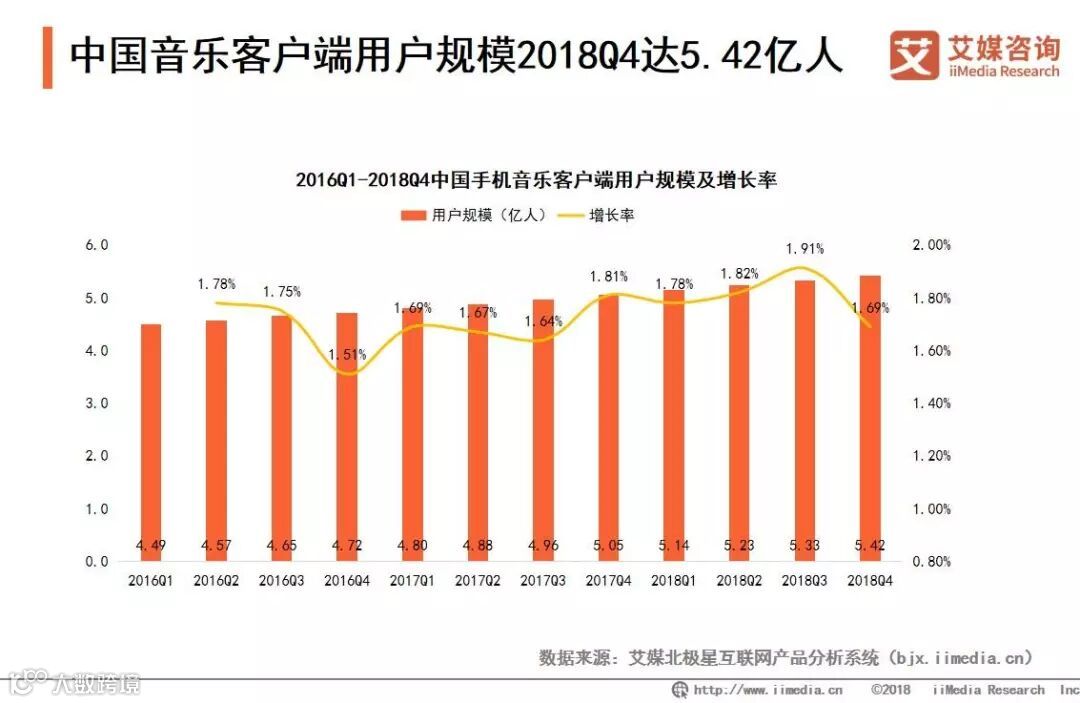 中国音乐客户端用户规模2018Q4达5.42亿人