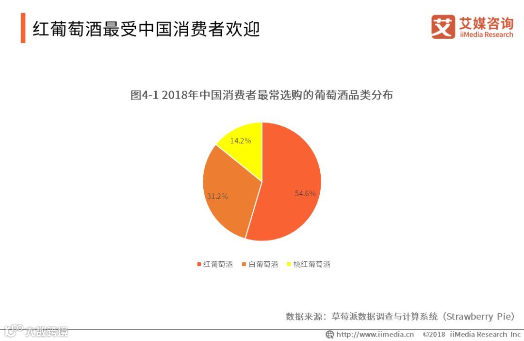 消费者购买不同品类葡萄酒的选择上,红葡萄酒所占比例为54.6%,是消费者的首选,远高于白葡萄酒的31.2%和桃红葡萄酒的14.2%。