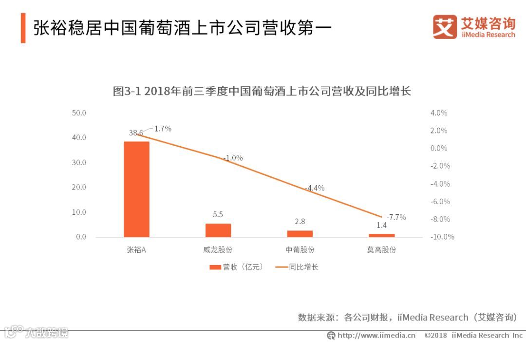 2018年前三季度中国葡萄酒上市公司营业收入中,张裕以38.6亿元的营收额稳居第一。另外,除张裕的营业收入微增1.7%外,威龙股份、中葡股份和莫高股份均较2017年同期微降。
