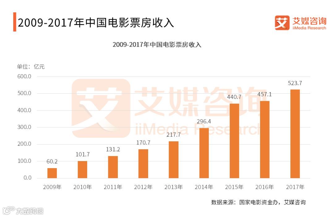 2017年,中国内地分账票房最终以523.7亿元的成绩收官,历年来首次突破500亿元。另外,全国新增电影银幕9597块,银幕总数达到50776块,稳居世界第一位。