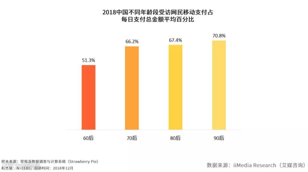 值得注意的是, 报告还对上述线下消费使用移动支付的人群进行年龄分析,其中,90后群体每日线下消费时选择移动支付的支付金额占总金额比重最高,为70.8%,60后群体比重最低,为51.3%。