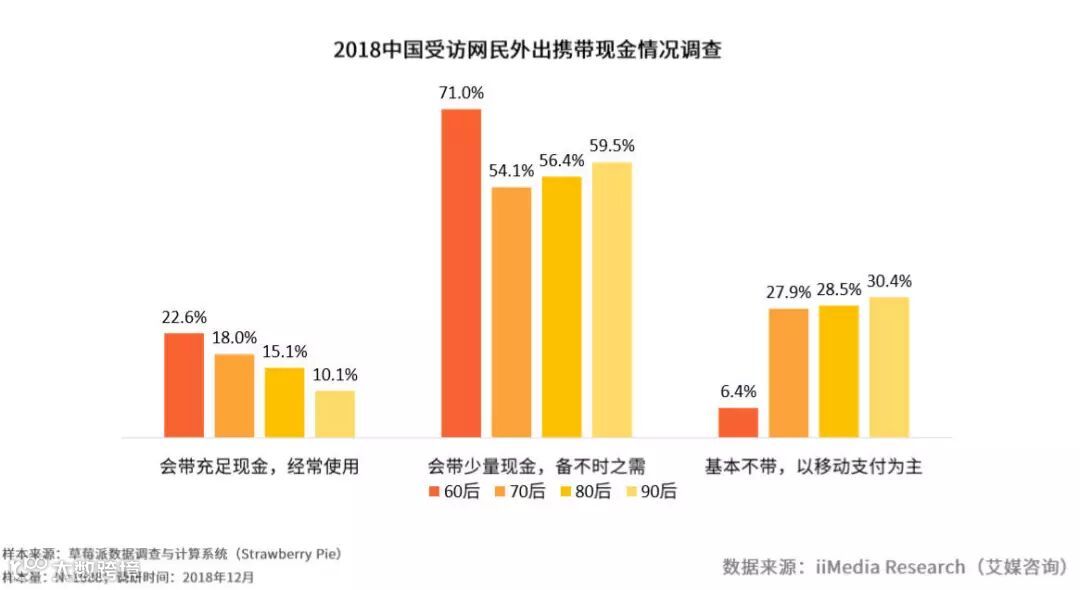 报告指出,在对受访者外出时是否携带现金时,60后、70后、80后、90后皆有超半网民表示外出时仍会携带部分现金,以备不时之需。而对于外出时基本不带现金,全部选择移动支付的调查中,90后所占的比重也为最高,为30.4%。