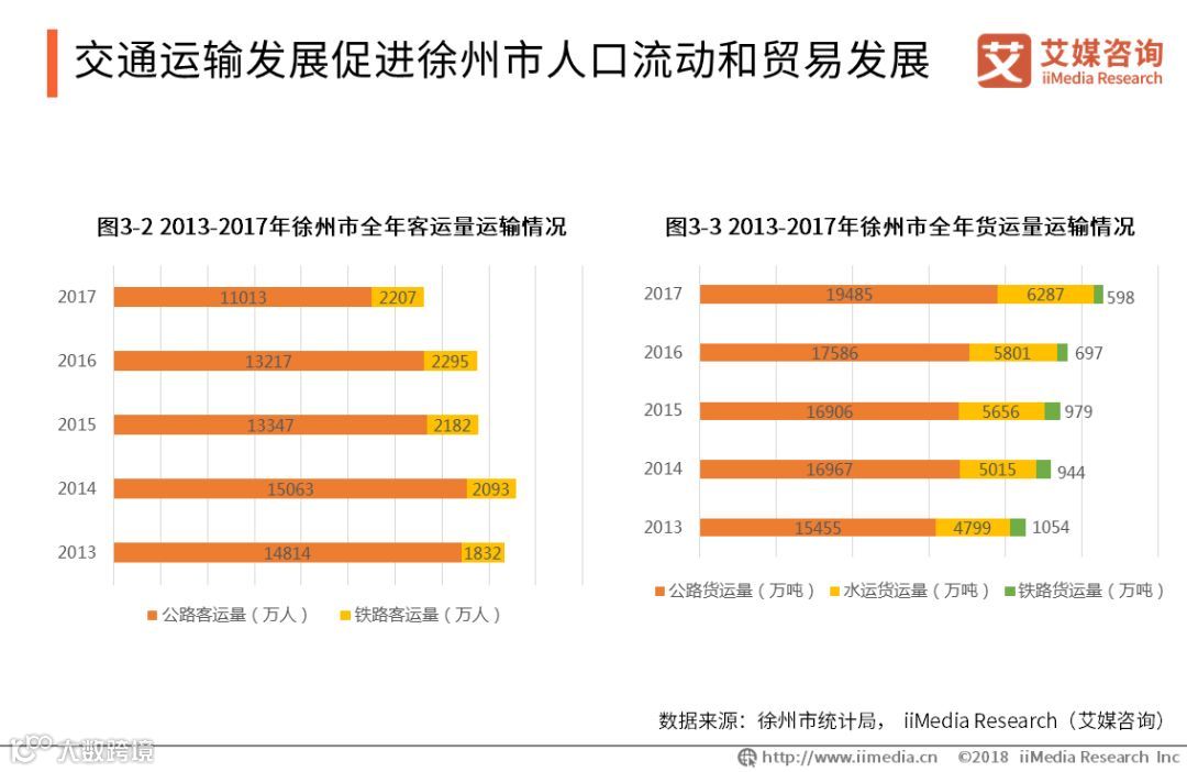随着交通网络的不断丰富,徐州的交通运输业不断发展,2017年徐州市全年客运量和货运量分别达13662万人和40152万吨,人口的流动为城市商贸发展提供了消费客群基础,促进城市商业贸易发展。