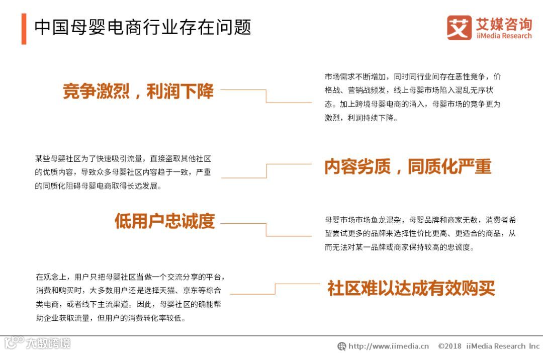 互联网普及率的上升和网络零售的发展驱动中国母婴电商发展,2018年中国母婴电商商品市场交易规模约达3.0万亿元,行业仍处于高速发展阶段。目前众多电商巨头企业均布局新零售母婴店,母婴电商也通过布局母婴社区以了解用户需求、提高平台流量和刺激多方消费,从而形成发展新动力。iiMedia Research(艾媒咨询)数据显示,2018年贝贝网月均活跃用户数达543.1万,全网渗透率为0.52%,发展具有用户规模优势。但母婴电商品牌上市道路曲折、投资事件数量不足,说明母婴电商产品质量问题等为外部投资制造了阻力。艾媒咨询分析师认为,继续布局新零售、开拓男性用户市场、向综合型平台拓展等是母婴电商未来发展趋势。(《中国母婴电商产业研究与商业投资决策分析报告》完整高清PDF版共44页,可点击文章底部下载按钮进行报告下载。)