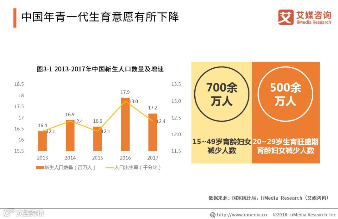 2016年,全面二胎政策正式实施,80、90后妈妈进入生育高峰期,2017年,中国出生人口为17.2百万人,较2016年有所回落。2018年,中国15~49岁育龄妇女人数比2017年减少700余万人,其中20~29岁生育旺盛期育龄妇女减少500余万人。数据反映出年青一代的生育意愿有所下降,母婴市场的用户规模发展进入稳定期。