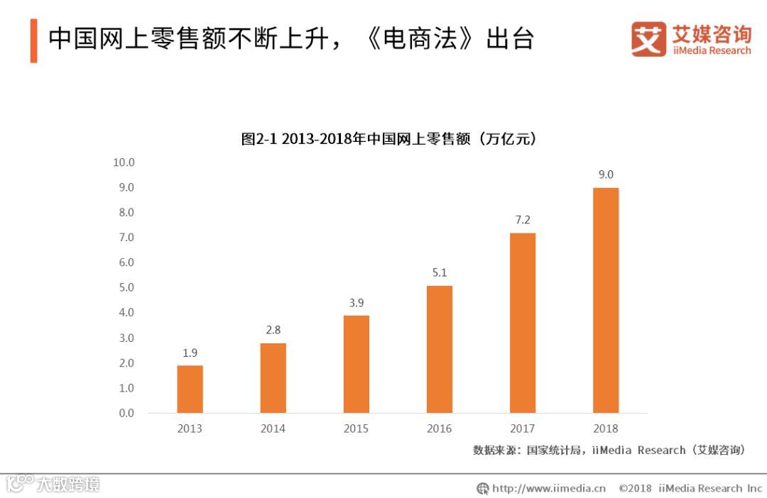 2018年,中国网上零售额突破9.0万亿元。根据网上零售额走势,网上零售额仍会逐年上升。2018年8月31日,《中华人民共和国电子商务法》已由中华人民共和国第十三届全国人民代表大会常务委员会第五次会议通过,对电子商务经营者的资质、隐私保护和经营者的纳税问题等关键问题进行明文规定,并已于2019年1月1日起施行。
