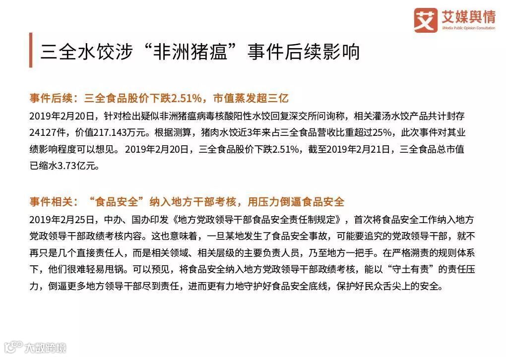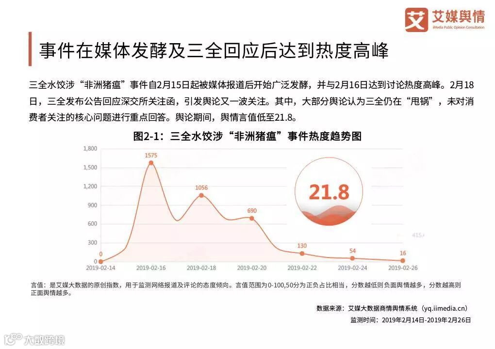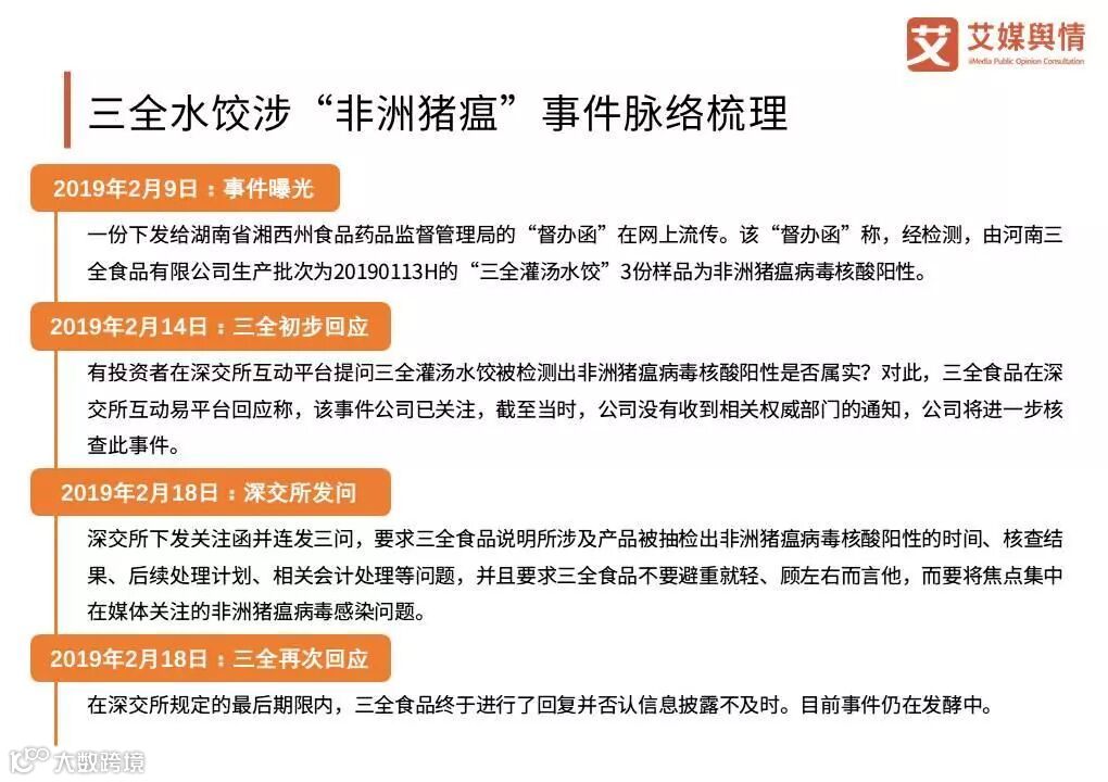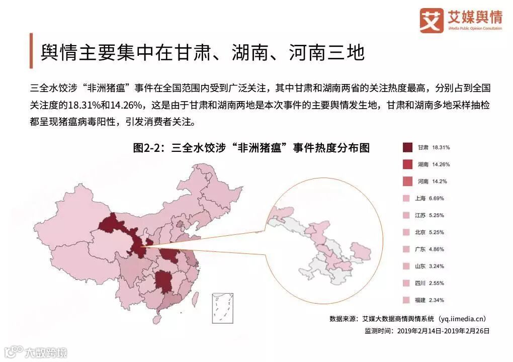 2019年2月15日,有媒体反映三全食品生产的“三全灌汤水饺”抽检呈非洲猪瘟病毒核酸阳性,食品安全问题再次引发舆论广泛关注。对此,深交所下发关注函并敦促三全食品尽快给消费者一个满意答复。根据艾媒大数据商情舆情系统(yq.iimedia.cn)显示,事件在2月16日达到讨论热度高峰,舆情言值低至21.8。甘肃和湖南两地作为主要舆情发生地,地区讨论热度最高。