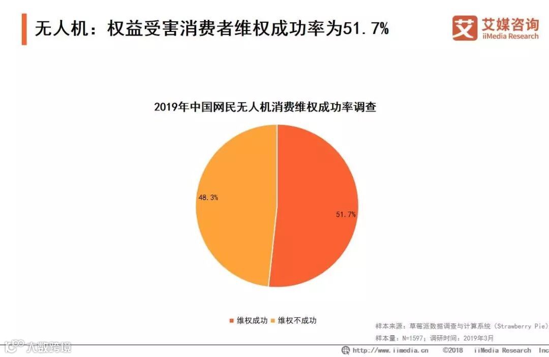 iiMedia Research(艾媒咨询)数据显示,无人机消费者整体维权率偏低,其中维权成功的消费者占51.7%,维权不成功的消费者达48.3%。艾媒咨询分析师认为,无人机消费问题主要集中在售后领域,而权责难确定是消费者维权成功率低的主要原因。