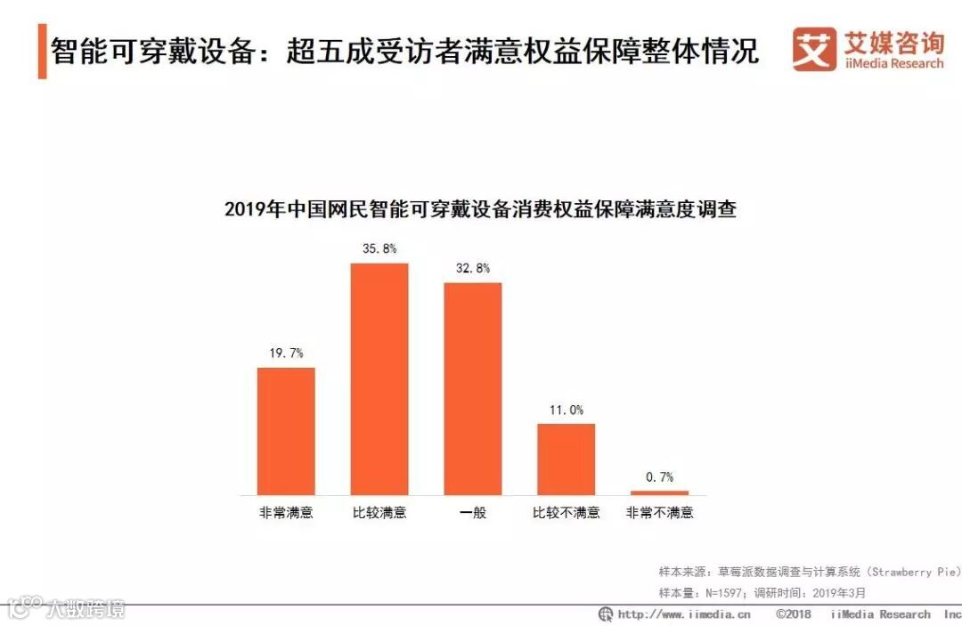 iiMedia Research(艾媒咨询)数据显示,19.7%的受访者非常满意智能可穿戴设备的权益保障,35.8%的受访者表示比较满意,约11.7%的受访者表示不满意。