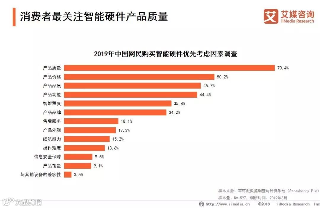iiMedia Research(艾媒咨询)数据显示,产品质量是中国消费者在购买智能硬件时首要考虑的因素,占比达70.4%,其次是产品价格,占比为50.2%,排在第三位的因素是产品品质,占比为45.7%。