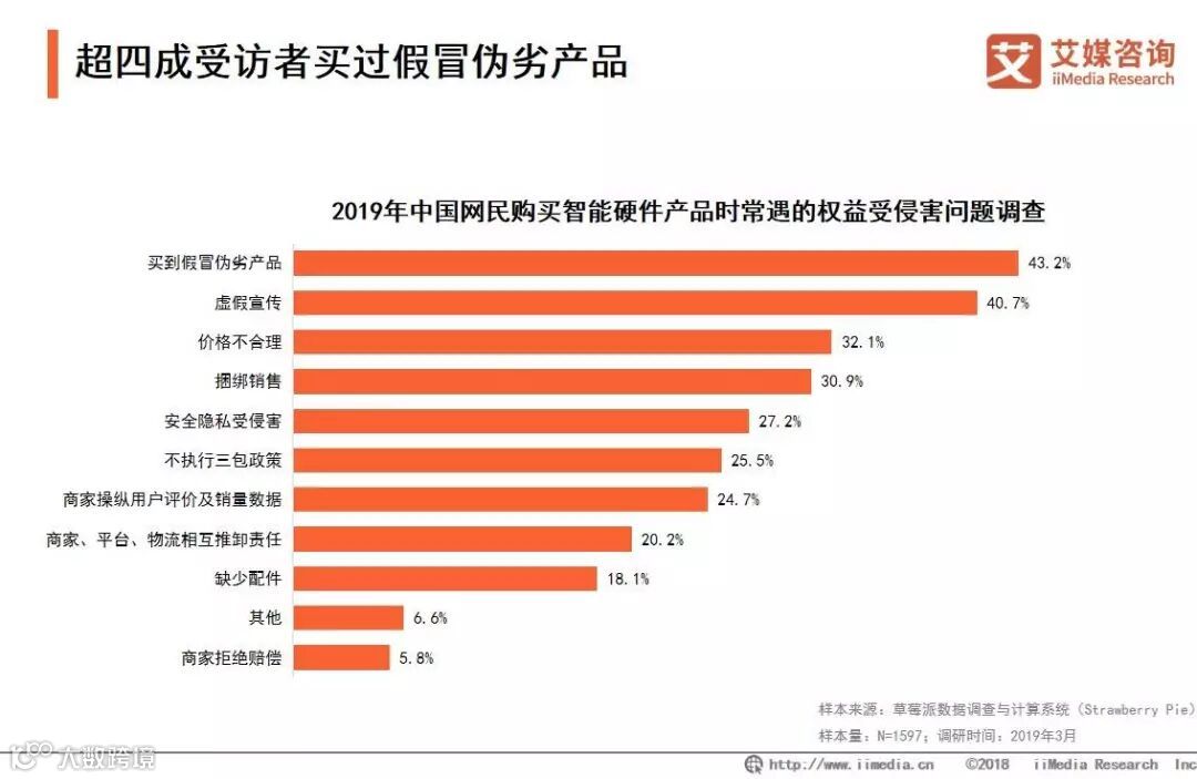 iiMedia Research(艾媒咨询)数据显示,超四成受访者表示买过假冒伪劣产品,40.7%的受访者经历过虚假宣传,32.1%的消费者遇过价格不合理的情况。