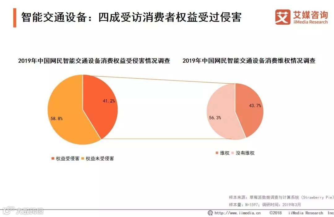 iiMedia Research(艾媒咨询)数据显示,41.2%的智能交通设备消费者有过权益受侵害经历,其中有43.7%进行了维权,56.3%未进行维权。