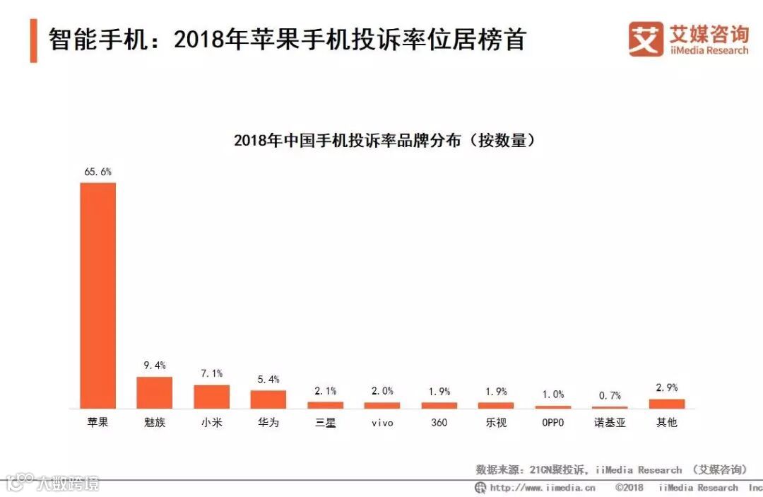 数据显示,2018年针对手机投诉方面,苹果手机投诉数量最多,占比高达65.6%。