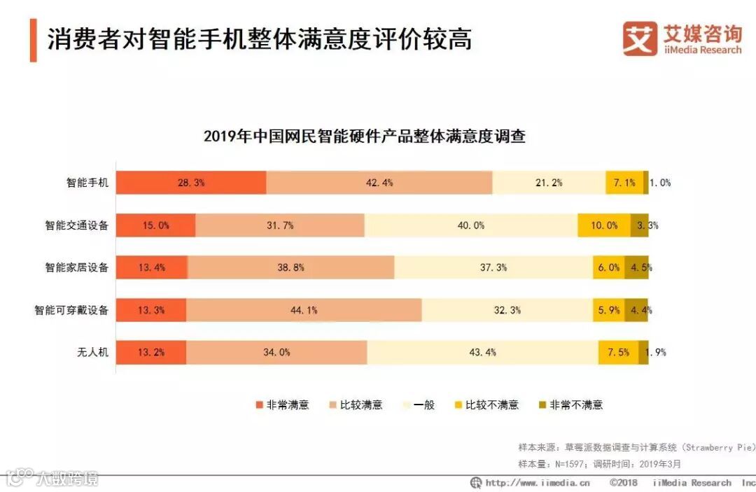iiMedia Research(艾媒咨询)数据显示,近七成受访者对智能手机感到满意,约六成受访者对智能可穿戴设备感到满意,消费者对智能交通设备整体满意度较低,仅有46.7%的受访者表示满意。