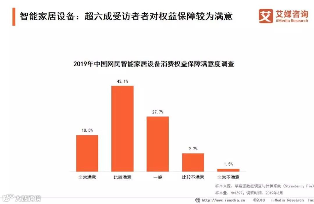 iiMedia Research(艾媒咨询)数据显示,18.5%的受访消费者对智能家居设备权益保障整体情况表示非常满意,43.1%的受访消费者比较满意。