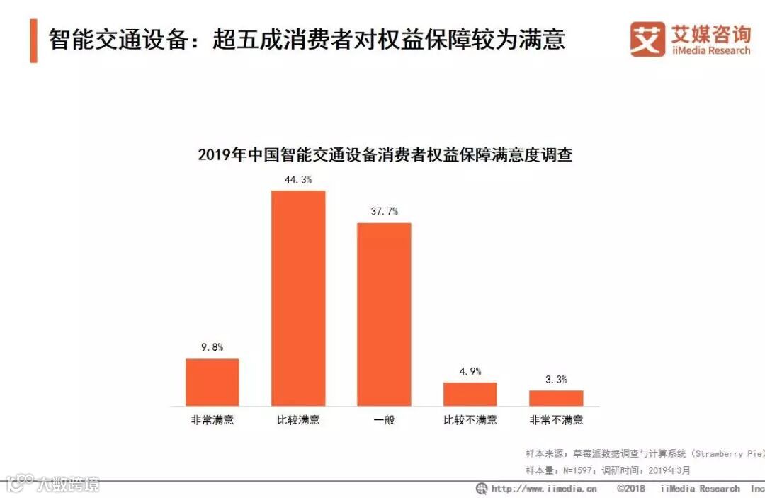 iiMedia Research(艾媒咨询)数据显示,9.8%的受访消费者对智能交通设备权益保障整体情况表示非常满意,44.3%的受访消费者比较满意。