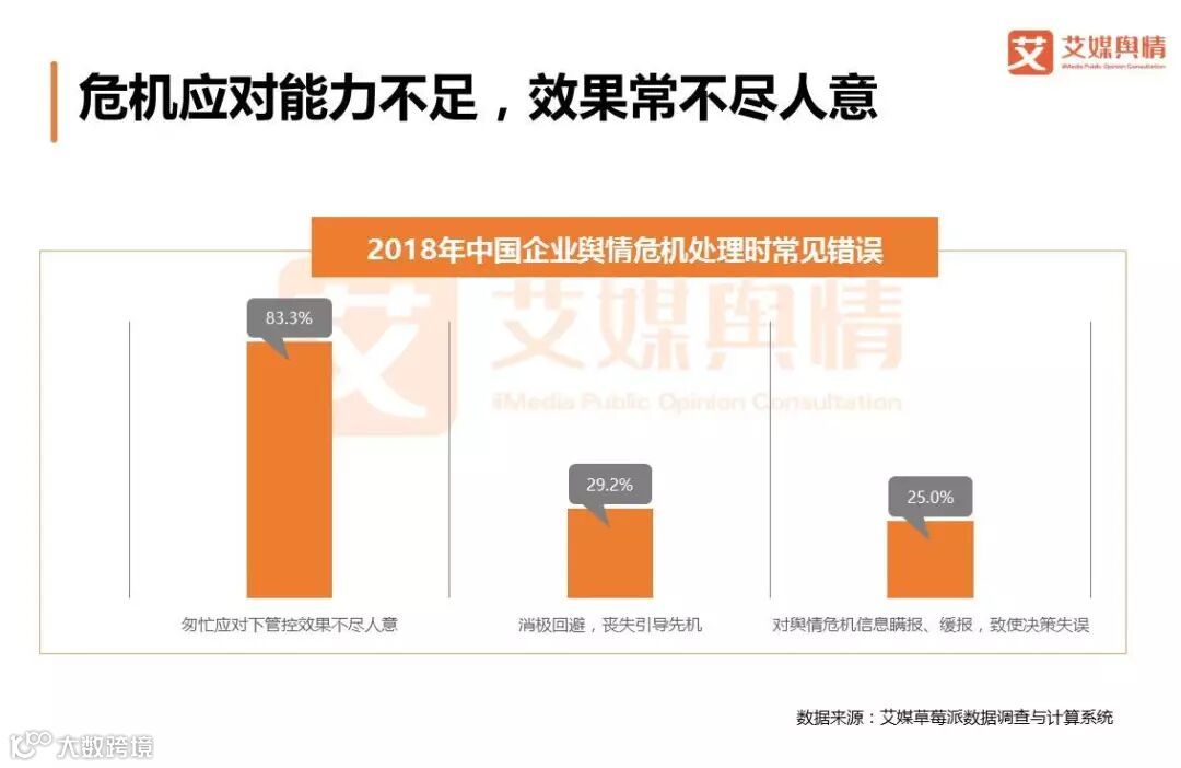 逾八成企业表示在舆情危机应对时受经验及应对机制限制而迫于选择匆忙应对,致使管控效果不尽人意,更有部分企业选择消极回避或欺报瞒报。