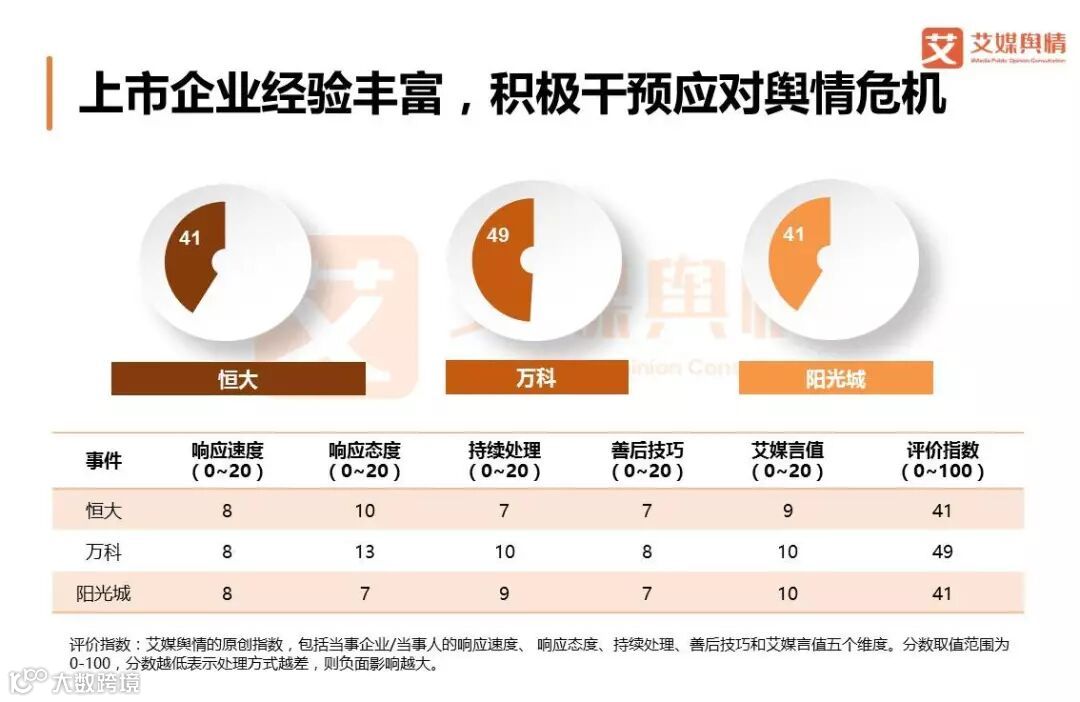 艾媒舆情发现,恒大、万科及阳光城在应对房屋质量舆情时采取的干预方式有所差异,所取得的评价效果也就存在不同。在响应态度上,万科回应相对迅速,且借助第三方政府的信源说明房屋的质量问题,并跟进处理,而恒大和阳光城并未建立及时有效的回应机制,致使舆情危机应对的评价指数相对较低。