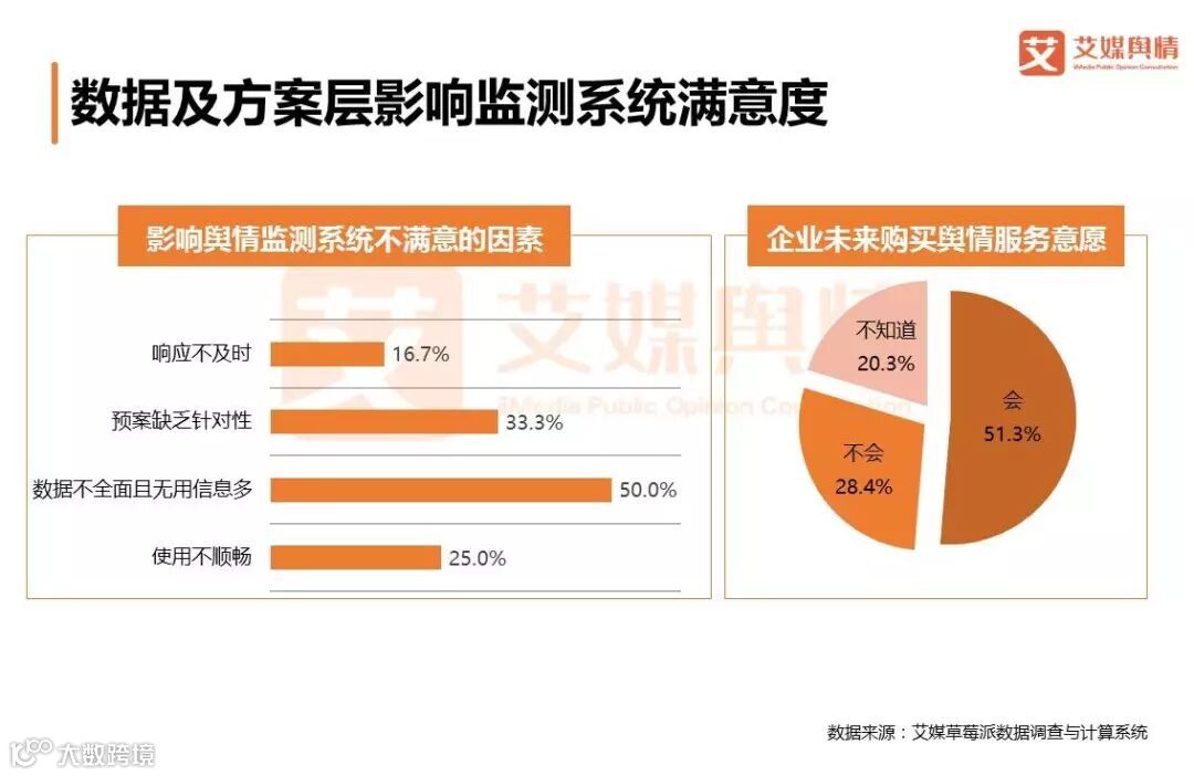 数据不全面且无用信息多导致监测结果缺乏准确性、舆情监测预案缺乏针对性研判机制是影响企业使用舆情监测系统满意度的主要因素,但超五成的企业表示未来有购买舆情服务的意愿,说明企业舆情管理意识较强且对监测系统保持乐观。