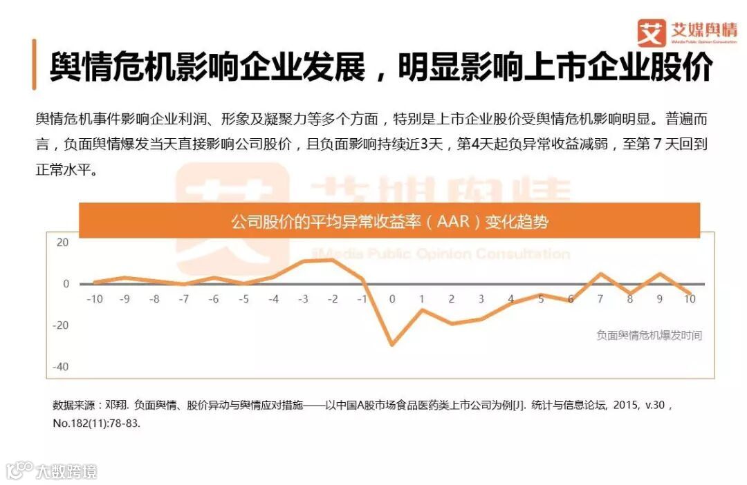 舆情危机事件影响企业利润、形象及凝聚力等多个方面,特别是上市企业股价受舆情危机影响明显。普遍而言,负面舆情爆发当天直接影响公司股价,且负面影响持续近3天,第4天起负异常收益减弱,至第7天回到正常水平。