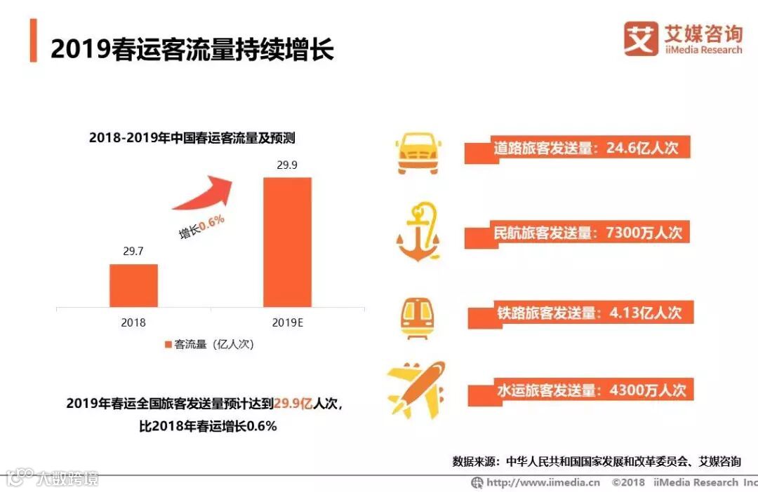 随着公共交通工具运力和覆盖地域扩大,2019年春运期间预计客运总量仍呈现上升趋势,但道路压力相较往年将有所减缓,主要呈现以下特点:大众出行体验将上升;道路客运仍然承载春运期间主要出行压力; 铁路、民航客运量呈现上升趋势;自驾出行明显增多。