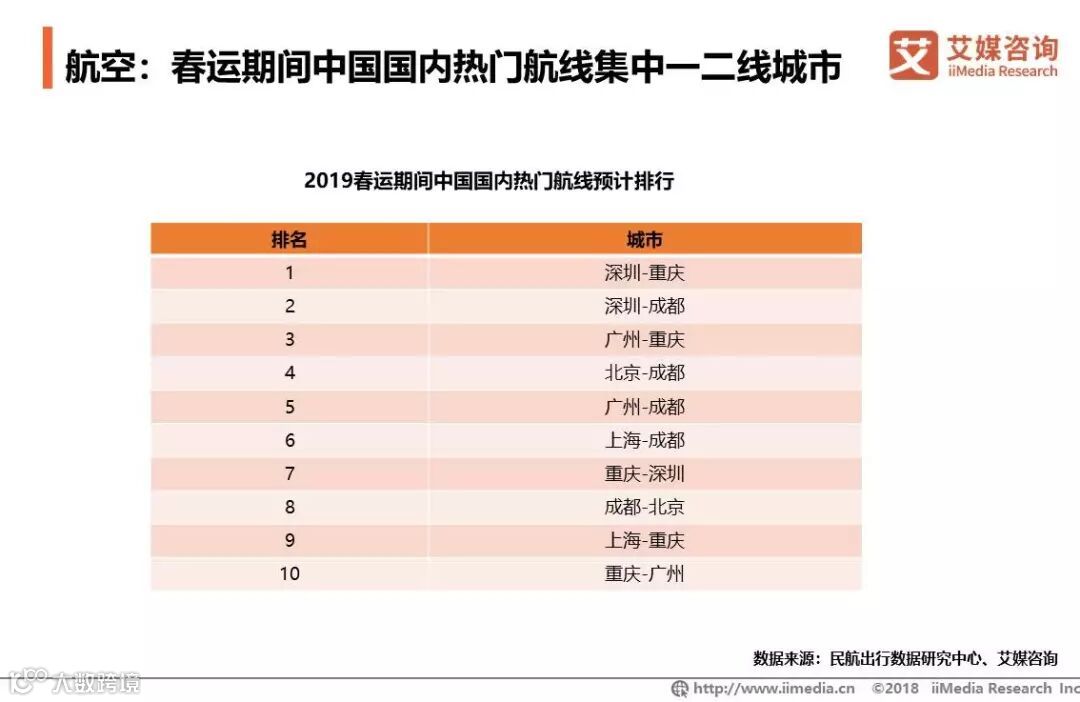 2019春运期间,中国国内热门航线主要集中在深圳、重庆、北京、广州、成都、上海等一二线城市。
