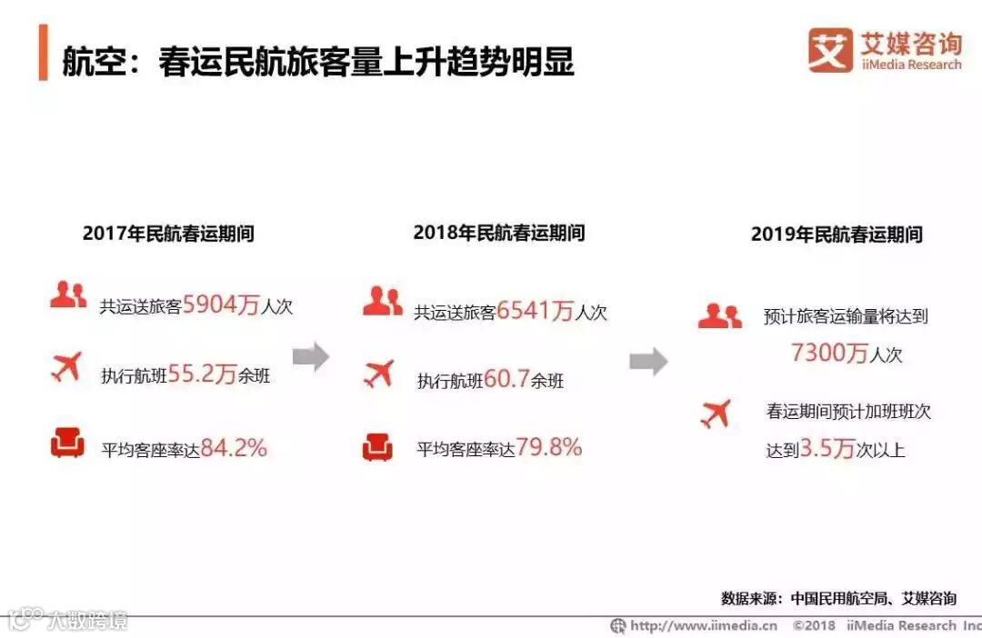 数据显示,近年春运期间,民航运送旅客量呈现明显上升趋势,2019年预计运输旅客量达到7300万人次,春运期间将加班班次3.5万次以上。艾媒咨询分析师认为,随着人们消费能力提升,以及航空交通运输业务发展趋于成熟,在春运期间选择飞机返乡和出游的人次上升,未来民航将成为人们春运出行重要选择方式。