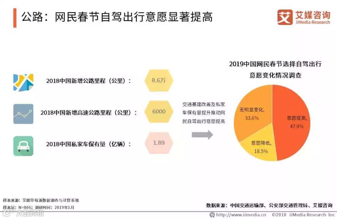 iiMedia Research(艾媒咨询)数据显示,47.9%的受访网民表示2019春运期间选择自驾出行的意愿显著提高。艾媒咨询分析师认为,人们生活水平提高,私家车保有量不断提升,同时国家加强公路建设,春节自驾出行增多的趋势明显。