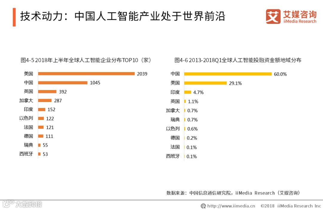 截至2018年上半年,全球共有4998家人工智能企业,其中中国拥有1045家,全球排名第二,位于美国之后。另外,中国在人工智能方面的投资力度强大,投融资金额占全球60.0%,位于世界首位。中国人工智能产业的蓬勃发展是智能音箱产业前进的最大后盾。
