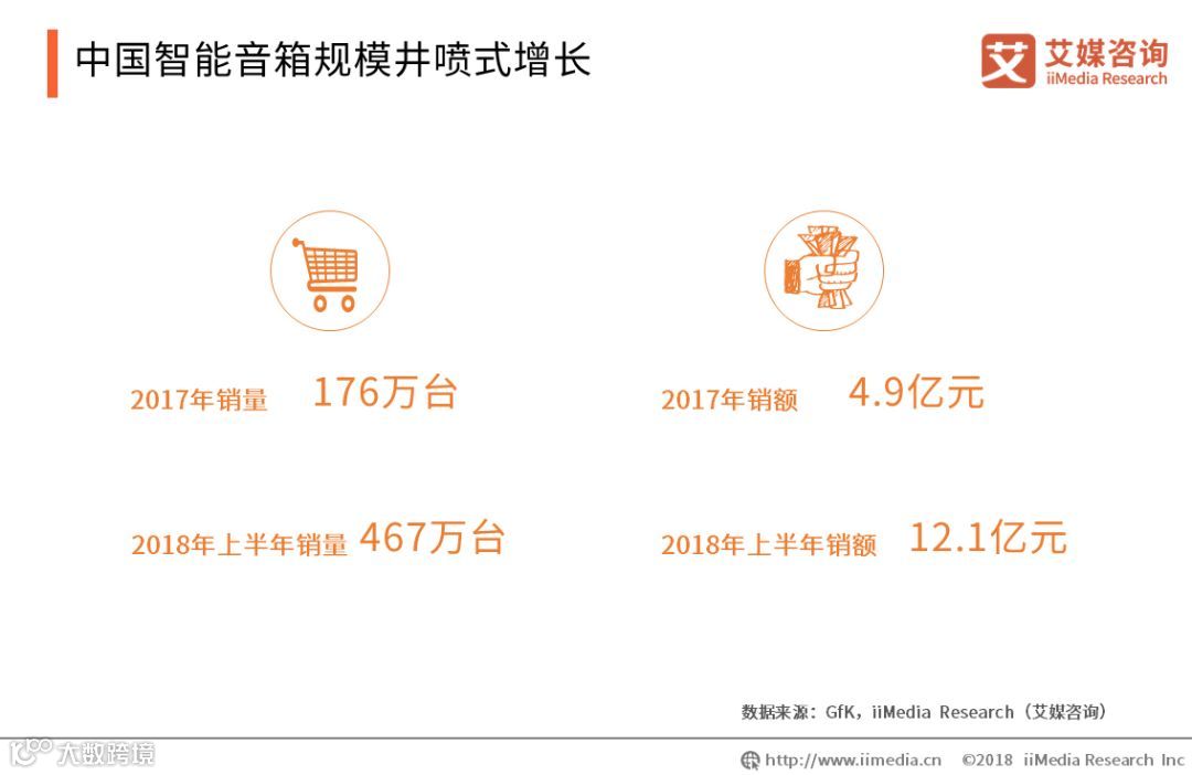 2018年上半年,中国智能音箱的销量达到467万台,销售额为12.1亿元,只半年销量已大幅度超过去年全年水平,中国智能音箱市场规模实现井喷式增长。