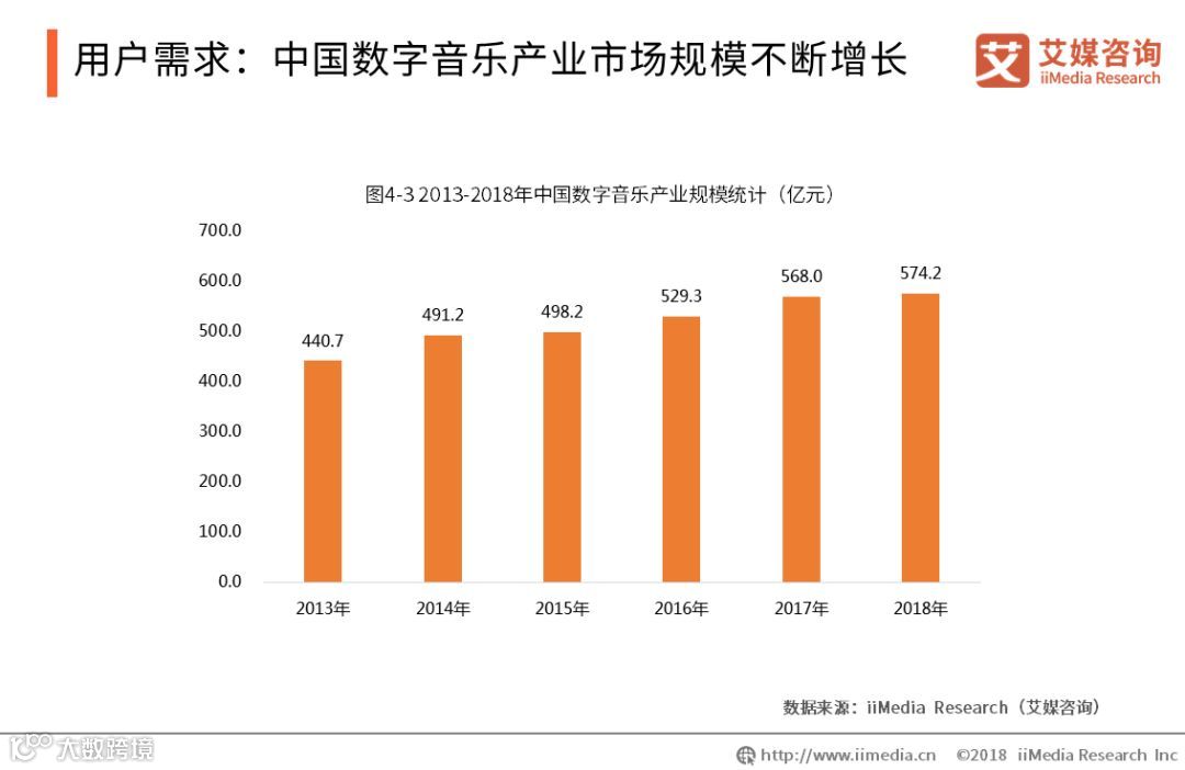 2013-2018年中国数字音乐产业市场规模不断增长,2018年产业规模达到574.2亿元。受益于数字音乐的快速增长,智能音箱产业的发展也得到相应推动。