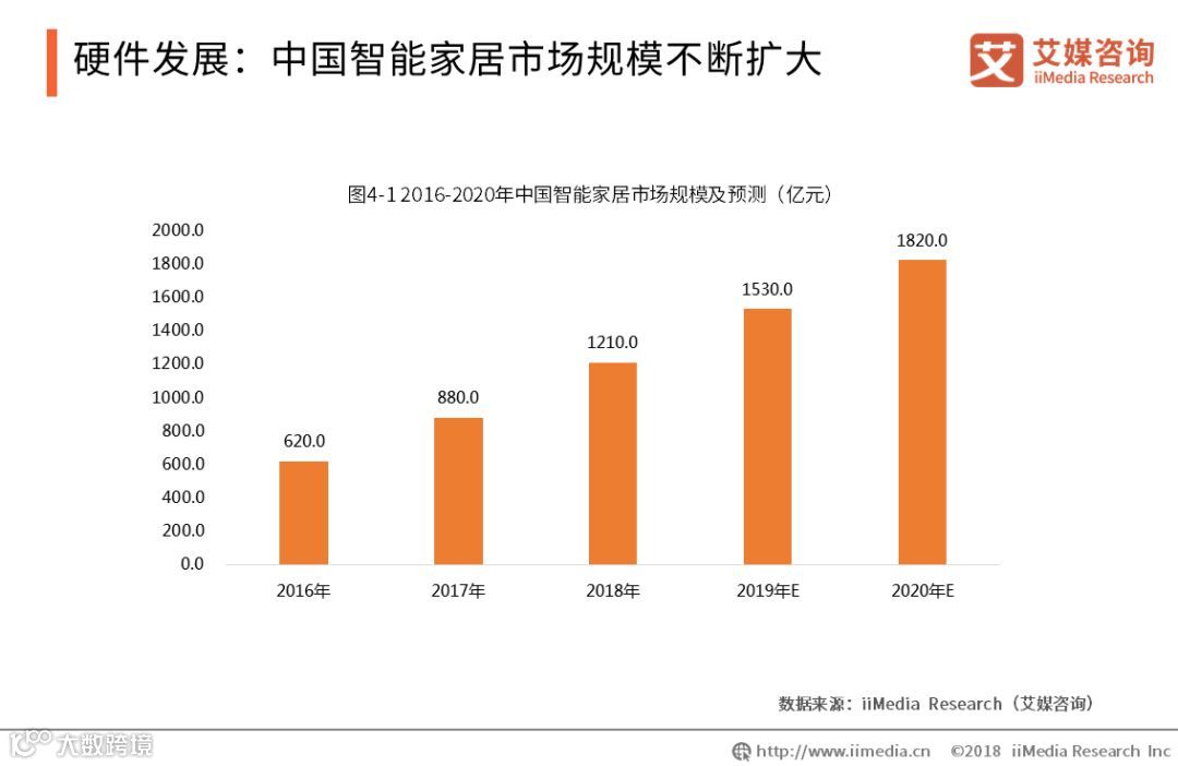 在人工智能和物联网技术的发展带领下,智能家居蓬勃兴起,虽市场规模增长速度有所放缓,但将保持持续稳定增长态势,2020年市场规模将突破1800.0亿元。